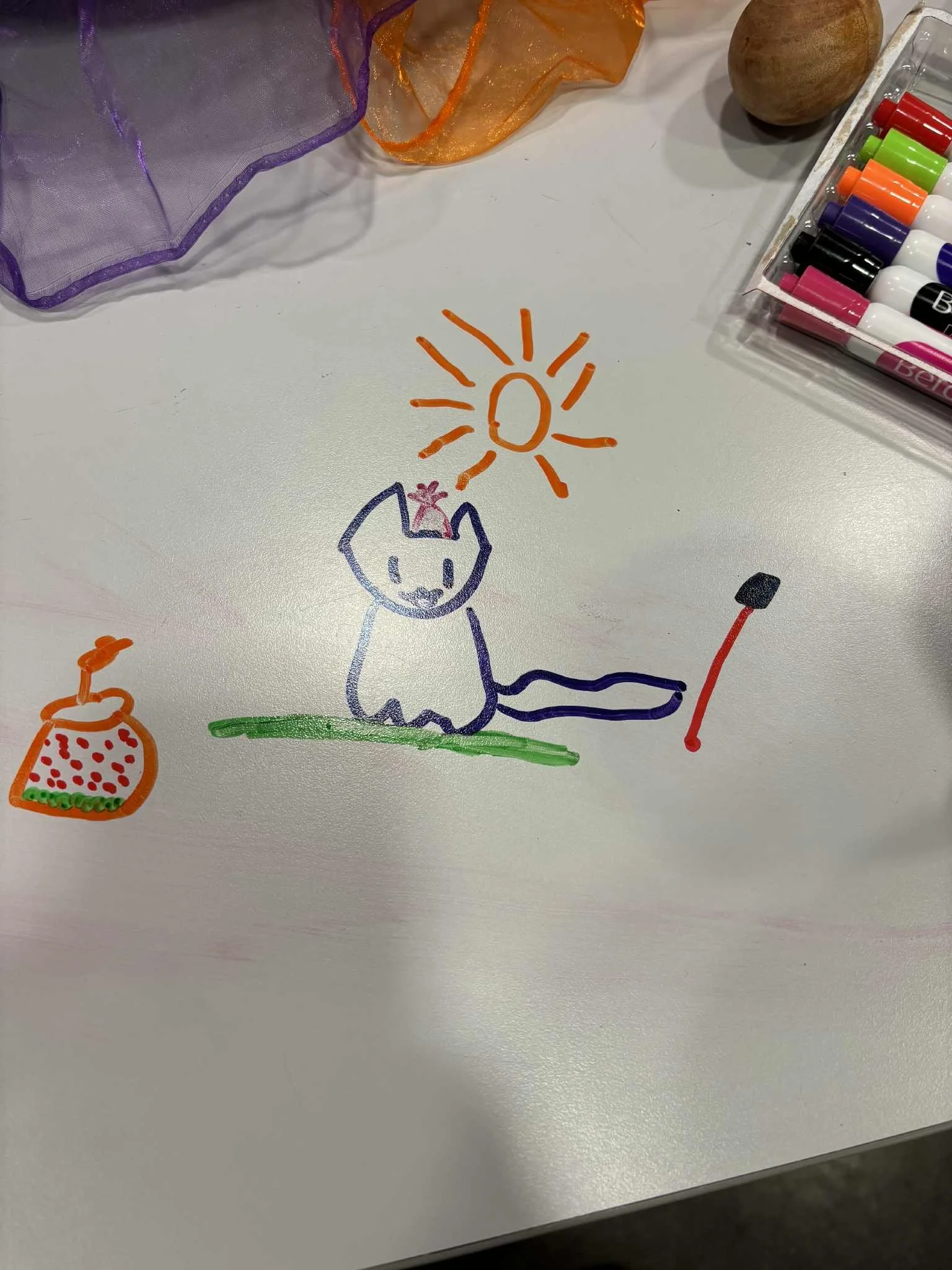 Using graphic scores (including this excellent cat drawn by a 6 yr-old) and experimenting with colours, we co-created with children to create some original pieces.